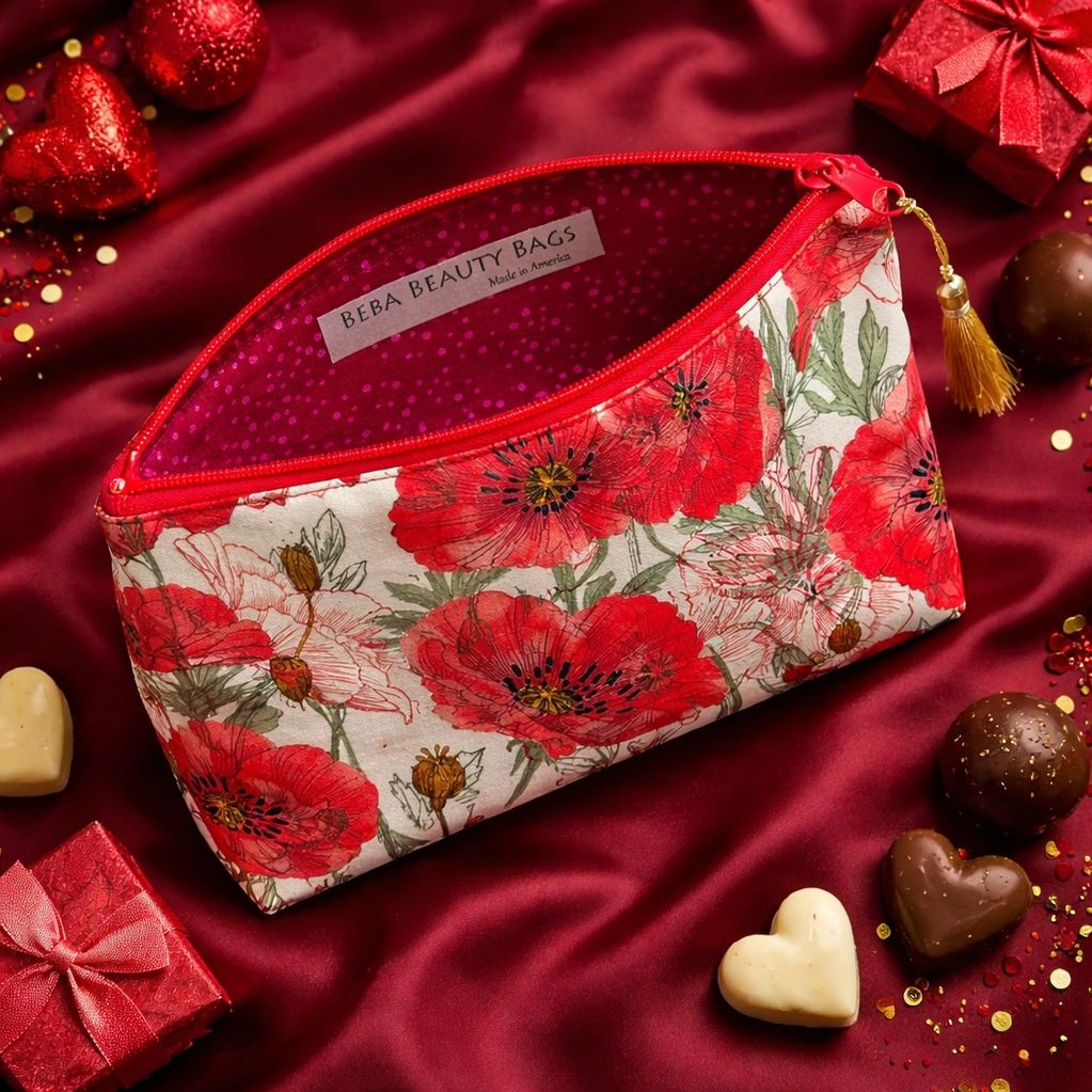 Just in time for Valentine's Day, discover the ultimate red cosmetic bag featuring stunning shimmery red grunge moda fabrics. This bag is beautifully quilted with silver metallic thread, enhancing its shimmer, and comes adorned with a matching shimmery silver tassel. Inside, you'll find a striking animal print cotton lining that adds a delightful wild touch to your style.
