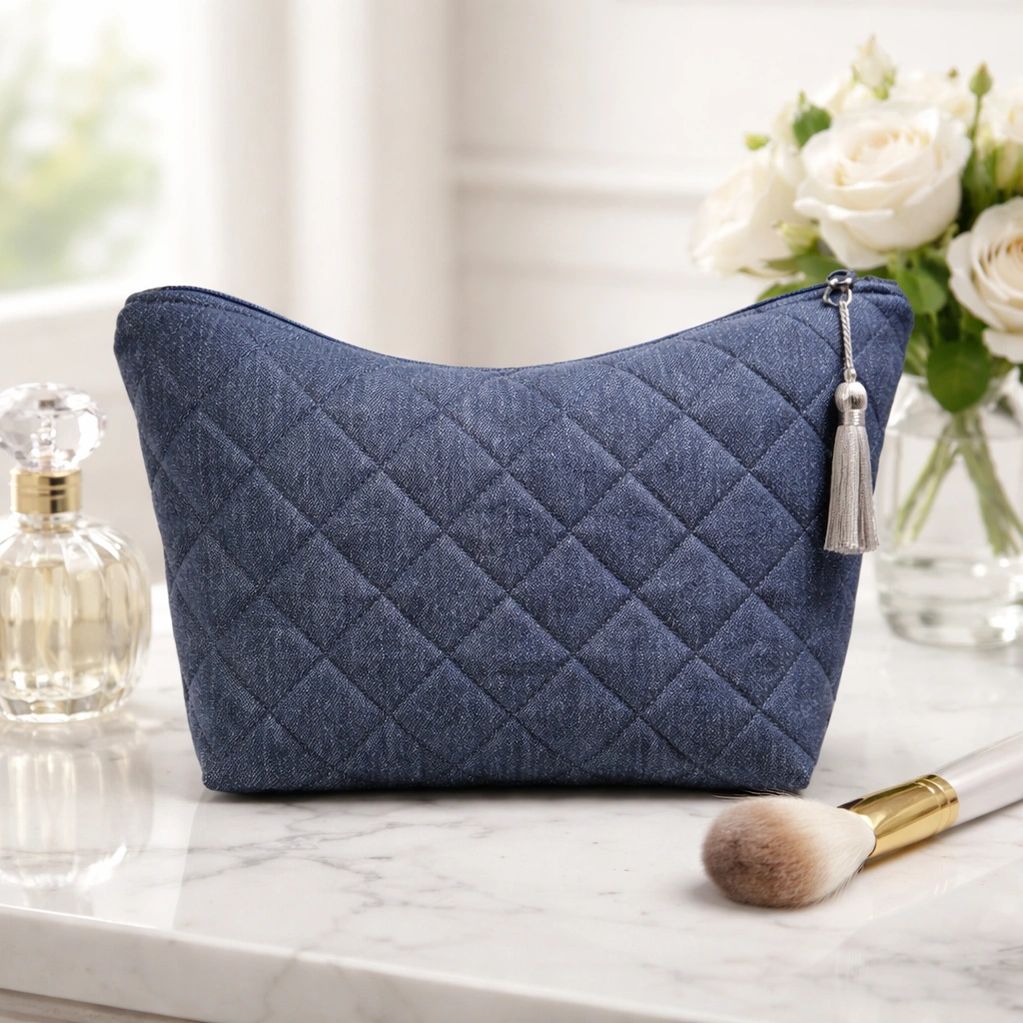 The elegant quilted cosmetic bag is a must-have accessory for mothers on the go. Crafted from luxurious shimmering jean fabric, it features diagonal quilted lines and is accented with a stunning silver tassel, enhancing its eye-catching shine. This bag is the perfect complement to your denim style!