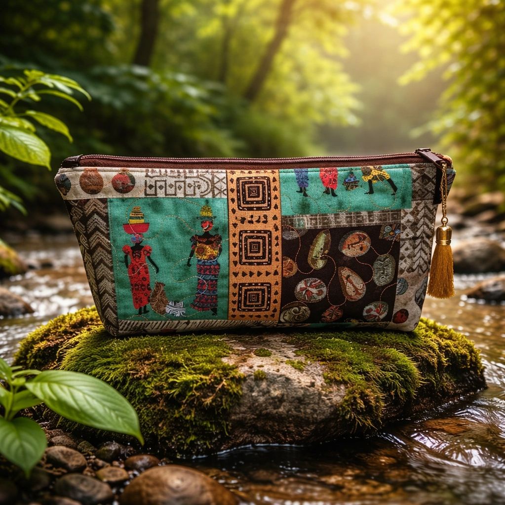 Introducing a one-of-a-kind quilted zipper pouch, ideal for keeping all your essentials organized while you're on the move. This fresh patchwork design features vibrant Tribal Patchwork and captivating African-themed imagery. Perfect for adding a touch of style to your daily adventures!