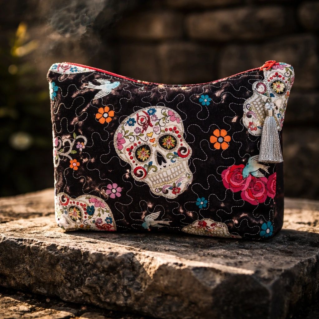 This colorful and glittery Zipper pouch features traditional Mexican sugar skull design, combined with the metallic-thread quilting and matching silver tassel along with red zipper, creates a lively and unique accessory. All zipper pouches are lined beautifully inside and delightful for storing cosmetics, and other personal items, or as a fun gift!